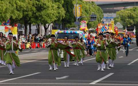 神戸祭りと言えば、メインイベントはパレードで、13:00~17:00まで延々神戸中心地を練り歩きます。登場するのは地元の団体、学校、法人などまさに市民祭りという感じ。沿道に観客は多いのですが、出場者の親族・知人の方も相当応援に駆けつけている感じ。