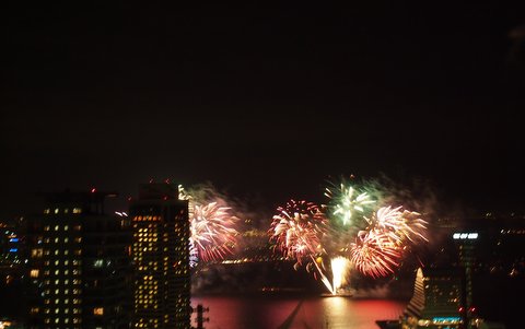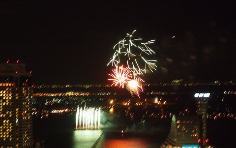 ビールを片手に花火観覧。他の階のベランダから、ギャーとかウォーとか子供の叫ぶ声が。これもBGMと割り切って。