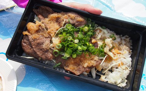 タイ料理のソーセージにピザ、スジ肉の煮込み。それに、イチボの焼肉丼。焼肉丼は人気のにくなべやびいどろの出店でした。