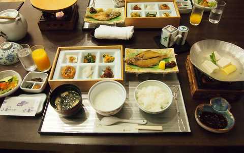 旅館井づつやでの朝食は純和風。カレイの干物は子供の頃よく食べたなぁ・・・。