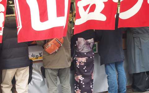 途中の山笠ラーメンでは、立ち喰いラーメンをすする着物姿の女性の姿が。お正月ならではの風景です。