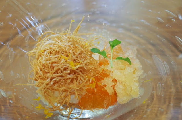 甘夏を中心にしたデザート。生の果肉、ジュレ、ピュレなどさまざまな食感を楽しめます。