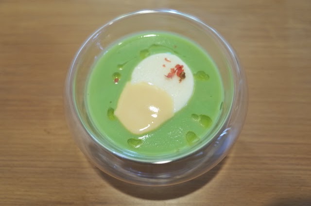 グリーンピースのスープ。ホタテのムースと、ホタテのひもの赤いところだけを使ったソースが載っています。スープひとつをとっても手間がかかっていますよね。