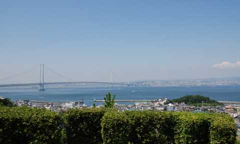 明石海峡大橋をバスで渡ります。バスはできるだけ前方に乗るのがお薦め。こんな景色は、前方座席しか味わえません。