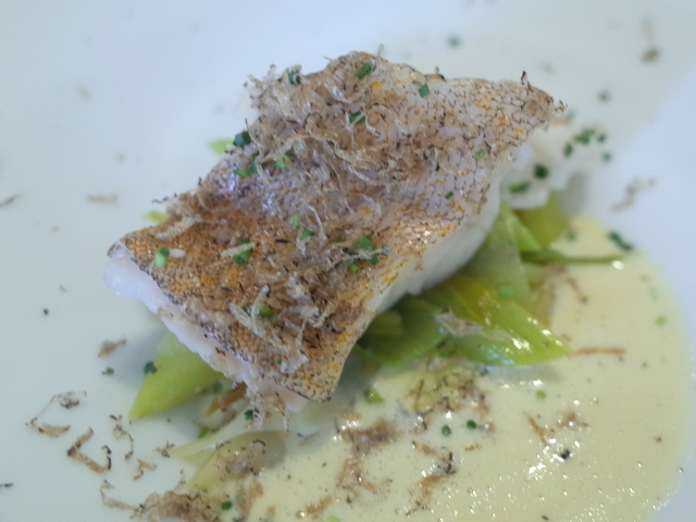こちらのお店、全ての料理が美味しいのですが、特に魚料理は絶品。この日は石川さんのアコウ(きじはた)。白身で柔らかいお魚です。ポロネギのソテーとポロネギのソース、サマートリュフをちらしてあります。