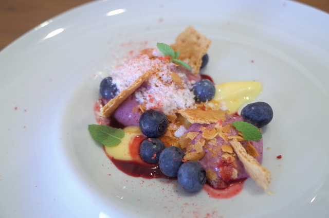デザートはブルベリーのムース。ブルーベリーも夏が旬ですもんね。コース料理の最後なのでそれほど甘くないデザート。いつもながら美味しい。