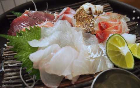 刺身盛。一切れが大きくは無いですが、種類が豊富。魚の質も良いです。白身の魚に少しすだちを絞って塩で食べるのが好み。
