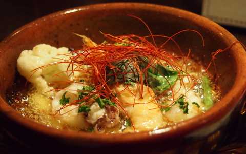 魚介と野菜のアヒーロ(Ajillo)という料理。アヒーロとは土鍋でにんにくとオーリブオイルを熱し、具材を煮込んだもの。初めて食べましたが、なかなかいけます。