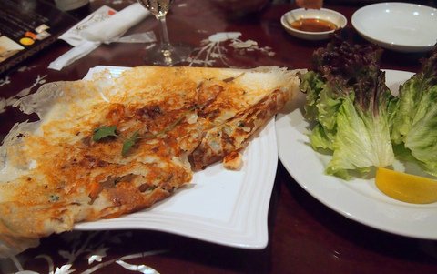 ベトナム風お好み焼き。サラダ菜で巻いて食べます。これもパリっとしていて、生春巻きと同じタレで食べるのですが、味の方は抜群。ただ1380円という値段設定。妻と2人、やっぱりこのお店の値段設定高いっ!って。