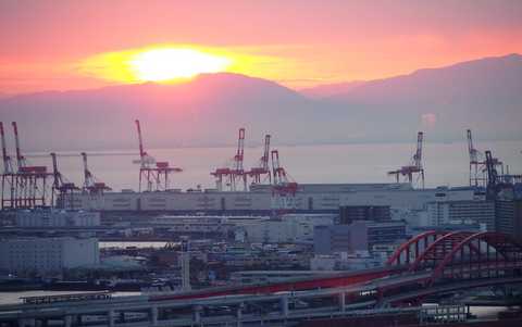 7:10頃、神戸大橋の向こう側、生駒山と雲の間に日の出が