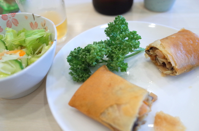 最初出されたサラダと海鮮春巻。春巻はさくっとしていて、餡も美味しいです。