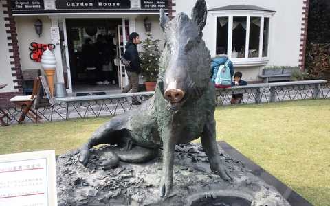 庭に鎮座するポルチェリーノの猪は、鼻に触ると幸運が訪れるというパワースポットです。皆が触るので、擦りきれて地肌が見えている・・・