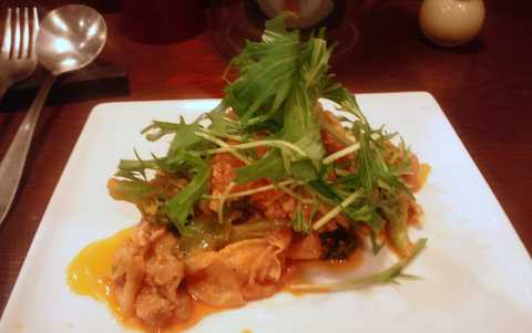 薄切り豚肉とゆばをトマトソースで煮込んだもの。煮込んであるので、どれが湯葉なのかわからない。家庭料理の延長戦上って感じ。