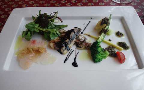 一番左がメジロ(ブリの若魚)に麦味噌のソース。イタリアンに味噌は不思議な組み合わせですが、美味しい。