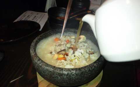 リゾットといいつつ、ビビンバの石鍋にコーンドビーフやキノコ、野菜などが入った石焼ご飯が運ばれてきます。これに、目の前で店員さんがスープをかけると、アツアツの石鍋でぐつぐつと煮えたぎり、湯気が立上ります。これをかき混ぜると出来上がり。