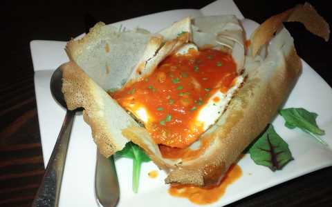 薄い生地に豚肉と半熟玉子、それにトマトソース。美味しい。