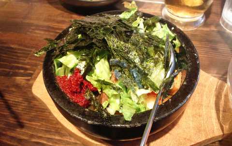 自分が注文した冷麺セットのミニビビンバ。これも注文がつく。決定的なのは焼が甘い。だからご飯におこげがつかず、せっかくの石焼なのに香ばしさがありません。