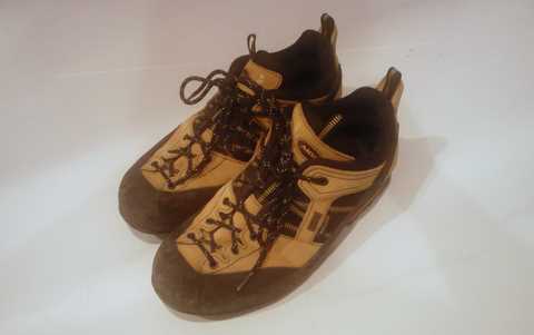 登山シューズが望ましい。砂地で滑りやすいところも多い為、滑り止めがしっかりしているのと、長時間の歩行から足を守ってくれます。 しっかり紐を結んでおくのがコツ。緩んでいると靴の中で足が暴れて、つま先なんかが痛くなります。