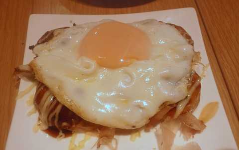 たこやきメニューは味付けやトッピングの組み合わせで結構メニューが豊富で400円~500円。オーダーは、目玉焼きのせ。う~ん、たこやきって感じ。