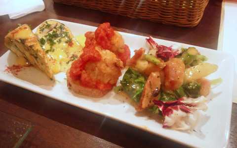 タパス(オードブル)の盛り合わせをオーダーすると、2皿に分けて持ってきてくれました。時間がかかるが故の工夫でしょうか。彩りが華やかで、味もバラエティに富んでいてバランスが良いです。