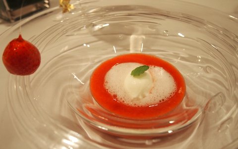 デザート4品から1品選択したイチゴスープ仕立て、練乳のシャーベット添え。これもイチゴがひきたっていてとても美味しかったです。