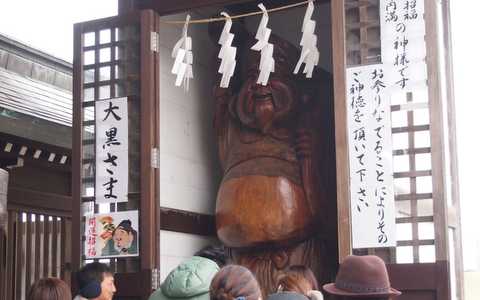 大石神社にある恵比寿さまと大黒さまの木彫りの像。なでるとよいそうです。