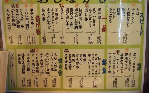 メニューは小鉢、刺身、串揚げ、焼き物など多彩。串揚げは70円のメニューも多く、三宮・元町界隈の串揚げ屋よりひとまわり安め。バナナの串揚げなんてのもあります。