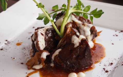 妻は肉料理を選択。『和牛ほほ肉の赤ワイン煮込み カカオの風味~カリフラワーのクレマのヴェスビオ仕立て』。なんだか分からん料理名ですが、クレマはコーヒーなんかでたつ細かい泡の事。ヴェスビオは調べてみるとイタリアで有名な火山で、料理の見た目が火山に見えるという事でしょうか。