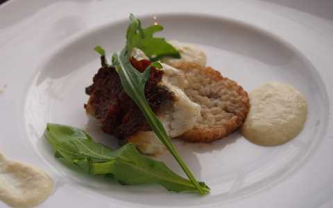 自分がオーダーしたのは魚。『本日の鮮魚のアルフォルノ~柚子風味の白菜ソース ゴボウの焼きリゾット添え』。魚はスズキでした。ソースも美味しいのですが、ゴボウの焼きリゾットが香ばしくて、淡白な魚とマッチしています。これも気に入りました。