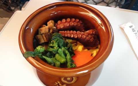 普段東京出張へは主に飛行機を使うのですが、たまたま新幹線に乗る機会があり、買ってみました。たこつぼモチーフの器に盛られています。