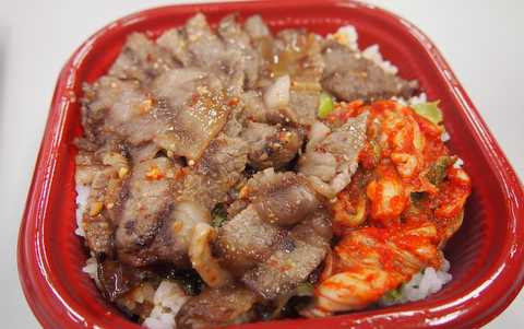 このお店の看板メニューカルビ丼650円。この日はお持ち帰りで、少し冷めかけていましたが、それでも炭火焼のカルビの香ばしさとタレの旨さは絶妙!