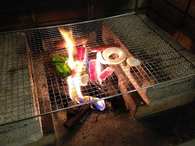 せっかくだからバーベキューの夕食。旧軽井沢で買った玉ネギ、ホテルの前のスーパーで買った牛肉、他もろもろ