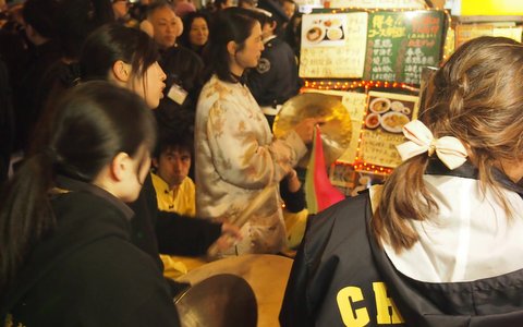 後方でシンバル(とは呼ばないと思いますが)や太鼓で応援しています