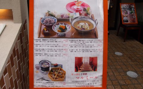 ランチメニューはマルミール御膳(墨うどんと鴨の冶部煮、おこぜのから揚げ、牡蠣フライの3種)、各種スープランチ1480円~。