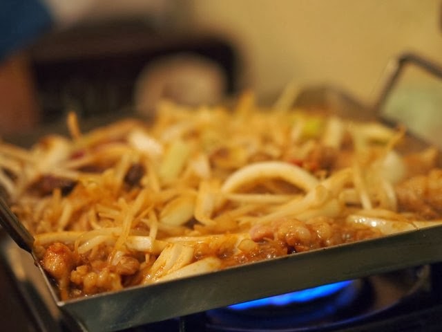 これが名物ちりとち鍋。ちりとりの形をした鍋に、もやし、玉ねぎのたっぷりの野菜。そしてテッチャン、ミノ、ハラミなどが盛られて出てきます。一人前1,800円弱だったかなぁ。