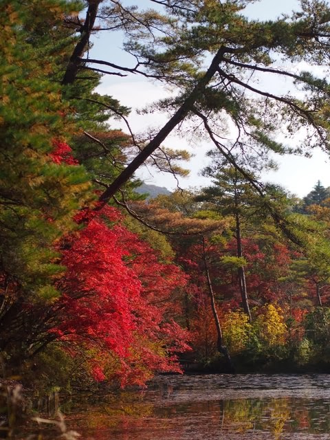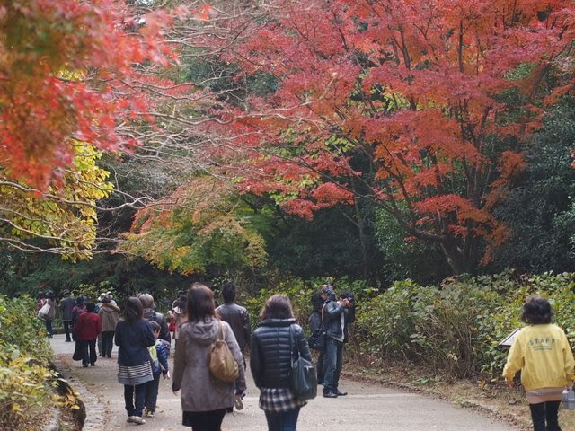 長谷池という園のほぼ真ん中にある紅葉スポット。この池の周りでは休憩をしたり、写真撮影をしたりする人々でごった返し。