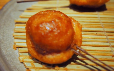 蓮根やコース外で追加した茄子。100円串揚げでは定番のネタですが、こういうお店ではあまり出てきません。でも蓮根はミンチ肉との合わせ、茄子はゴマ衣に赤味噌と、安い食材をとても満足感のある串に仕立て上げています。