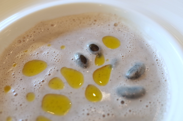 黒枝豆のスープ。色が黒枝豆から出た紫色に。黒枝豆がぷかぷかと浮かんでいます。