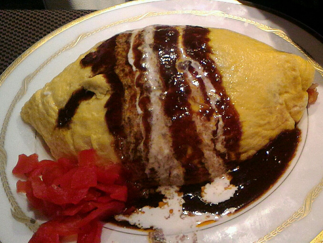 で、運ばれてきたのが、このオムライス。これね、写真じゃ分からないでしょうけど、デカいです。アメリカンフットボールのボール位ある。(分からないですよね・・・)しかも、たまごが分厚い。3~4個は使っているよね。