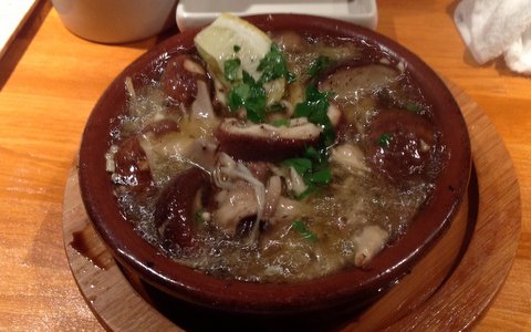 ガーリックとキノコをオリーブオイルでグツグツ煮た料理。動物性の脂肪はつらいですが、こちらは大丈夫。フランスパンをつけていただきます。