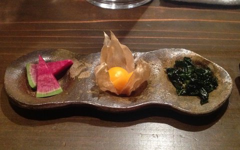 付きだしが、赤カブのピクルス、ほおづき、そして一番右の黒いのは海苔ではなくキャベツなんですね。どうやって黒くしたのか聞きませんでしたが、アテには良かったです。