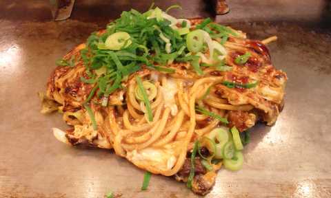 まずきゃべつとぼっかけを具に焼きそばを作ります。で、それを一旦とりおいて、次に薄いクレープのような生地を焼いきます。特徴的なのは、焼きそばを玉子と一緒に混ぜてしまう事。でこの玉子でとじた焼きそばをクレープの上にのせて、ひっくり返して焼いて、ねぎをのせれば出来上がり。