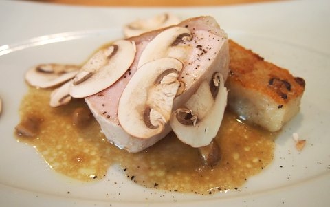 鹿児島の白美豚という豚のステーキにポルチーニ茸のソース。付け合せにキノコのリゾットを固めて焼いたものが添えて有ります。この豚も脂肪分が少ないのに凄く柔らかいし、ソースも美味しい。また、キノコの焼リゾットが香ばしくて満点。