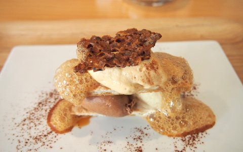 コーヒーとチョコの2種類のアイス、コーヒームース、キャラメルのコンビネーションのデザート。こちらのデザートはいつも甘さが控えめで、コース料理の最後には丁度いい感じ。