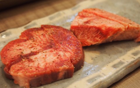 7~8mm位の厚さはある厚切りタンと、厚切りロース。タンは歯ごたえがあって、食べにくささえ感じますが、これはこれで有りと思う。