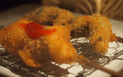 鱧と川エビの青紫蘇巻き。鱧は定番の梅肉と合わせてありますが、串揚げにすると全く違った味わいになります。芝エビの青紫蘇巻きは、このお店の定番メニューですね。
