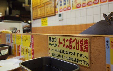 メニューは串カツが一本100円から。新世界風串カツ屋さんとしては、値段は平均的でしょうね。もちろん、ソースは2度漬け禁止。他にも小鉢やおでんなどもあります。