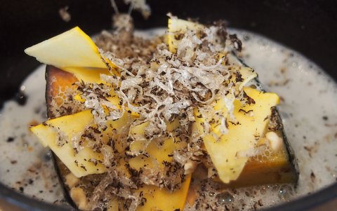 カボチャのソテーにコリンキーという生食用のカボチャのスライス、そしてサマートリュフをトッピングした一品。クリーム系のソースと合っています。