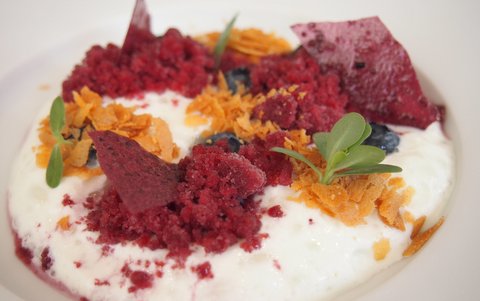 このデザートもVery Good!ヨーグルトだったかなぁ?。ブルーベリーのシャーベットと平べったいブルーベリーの飴がトッピングで見た目も鮮やかな一品。