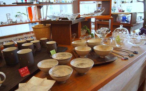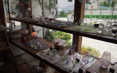 全国から50名のガラス作家の作品を集めたセレクトショップ。アクセサリや小物、食器類まで様々な作品が並べられていて、見ていても結構楽しい。